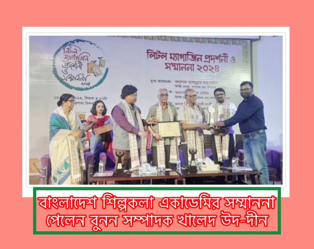 সিলেট প্রতিনিধি ঃশিল্প চর্চায় তাৎপর্যপূর্ণ অবদানের স্বীকৃতিস্বরূপ বাংলাদেশ শিল্পকলা একাডেমির সম্মাননা পেলেন ‘বুনন’ সম্পাদক ও রাগিব রাবেয়া ডিগ্রি কলেজের সহকারী অধ্যাপক, দৈনিক শুভ প্রতিদিনের সাহিত্য সম্পাদক খালেদ উদ-দীন। বুধবার (১০ জুলাই) বিকেলে বাংলাদেশ শিল্পকলা একাডেমির জাতীয় চিত্রশালা মিলনায়তনে ‘লিটল ম্যাগাজিন প্রদর্শনী ও সম্মাননা ২০২৪’ প্রদান অনুষ্ঠানে তাকে এই সম্মাননা প্রদান করা হয়। খালেদ উদ-দীন সিলেটের বিশ^নাথ উপজেলার সরুয়ালা গ্রামের সম্ভ্রান্ত পরিবারের সন্তান।