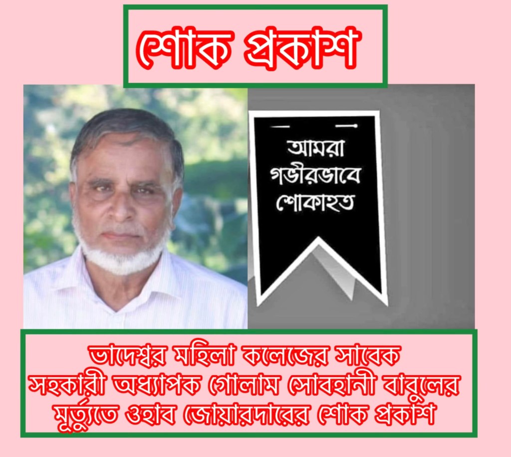 উনার মূর্ত্যুতে গভীর শোক প্রকাশ করেছেন ভাদেশ্বর মহিলা কলেজের রাস্ট্রবিজ্ঞান বিভাগের সাবেক প্রভাষক , বাংলাদেশ আওয়ামী স্বেচ্ছাসেবকলীগের সাবেক কেন্দ্রীয় কার্যকরী সদস্য , লুৎফা – মতিন ফাউন্ডেশনের চেয়ারম্যান জনাব আব্দুল ওহাব জোয়ারদার মছুফ ।