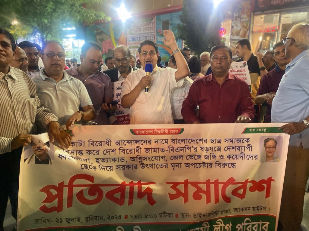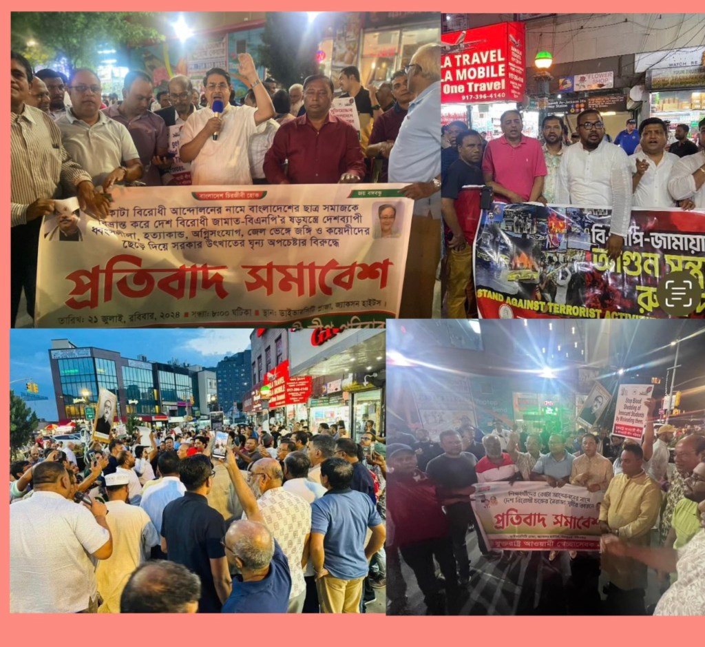 নিউইয়র্ক প্রতিনিধি ঃ দেশে চলমান কোটা আন্দোলনের নামে সাধারন শিক্ষার্থীদের কে ইন্দন যোগিয়ে জামাত বিএনপির অগ্নি সংযোগের প্রতিবাদে নিউইয়র্কের জ্যাকশন হাইটে যুক্তরাস্ট্র আওয়ামীলীগের স্মরণ কালের সব চেয়ে বৃহৎ বিক্ষোভ সমাবেশ গতকল্য ডাইভারসিটি প্লাজায় অনুস্টিত হয় ।