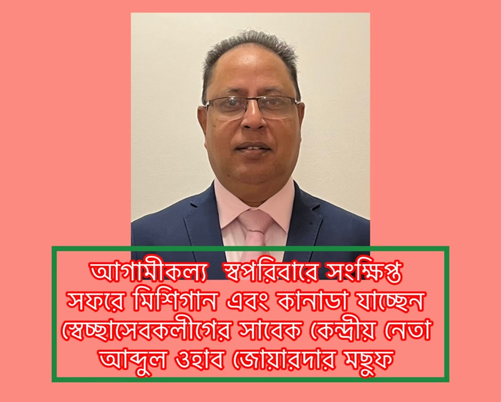 নিউইয়র্ক প্রতিনিধি ঃ আগামী কল্য সকাল ৬ ঘটিকায় নিউইয়র্ক জেএফকে বিমান বন্দর থেকে স্বপরিবারে আমেরিকান এয়ারলাইন্সের একটি ফ্লাইটে মিশিগান ও কানাডা সফরে যাচ্ছেন বাংলাদেশ আওয়ামী স্বেচ্ছাসেবক লীগের সাবেক কেন্দ্রীয় কার্যকরী সদস্য , লুৎফা – মতিন ফাউন্ডেশনের চেয়ারম্যান , ডাচ্ বাংলা ব্যাংকের সাবেক এসিস্ট্যান্ট ভাইস প্রেসিডেন্ট জনাব আব্দুল ওহাব জোয়ারদার মছুফ । তিনি সকাল ১০.৪৫ মিনিটে ডেট্রয়েট বিমান বন্দরে পৌঁছাবেন বলে আশা করা যাচ্ছে ।