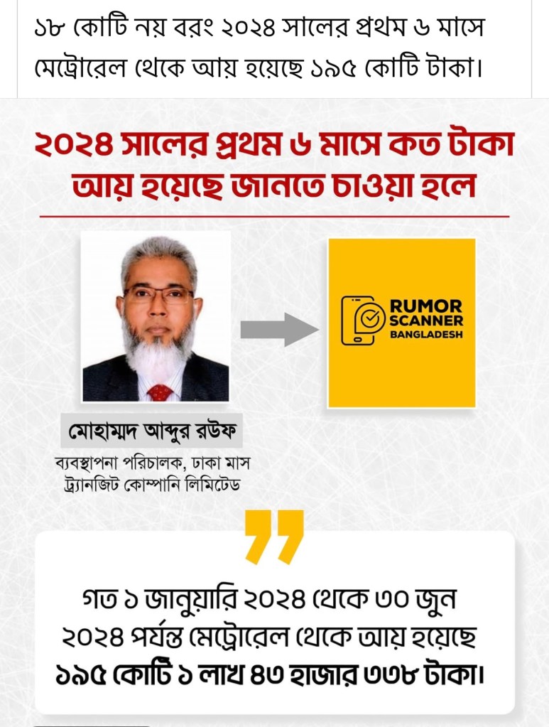 ২০২৪ সালের প্রথম ৬ মাসে মেট্রোরেল থেকে কত টাকা আয় হয়েছে তা জানতে রিউমর স্ক্যানার টিম যোগাযোগ করে ঢাকা মাস ট্র্যানজিট কোম্পানি লিমিটেডের ব্যবস্থাপনা পরিচালক মোহাম্মদ আব্দুর রউফের সাথে। তিনি জানান, গত ১ জানুয়ারি ২০২৪ থেকে ৩০ জুন ২০২৪ পর্যন্ত মেট্রোরেল থেকে ১৯৫ কোটি ১ লাখ ৪৩ হাজার ৩৩৮ টাকা আয় হয়েছে। অর্থাৎ, দেখা যাচ্ছে মেট্রোরেল ৬ মাসে ১৮ কোটি টাকা আয় করার তথ্যটি গণ-অভ্যুত্থানের পূর্বের বিগত গত ৬ মাসের নয়, বরং মেট্রোরেল উদ্বোধনের পর প্রথম ছয় মাস সময়ের। উল্লেখ্য, উল্লিখিত প্রথম ছয় মাস সময়ে সাম্প্রতিক সময়ের তুলনায় তুলনামূলক সীমিত পরিসরে মেট্রোরেল চলাচল করতো।