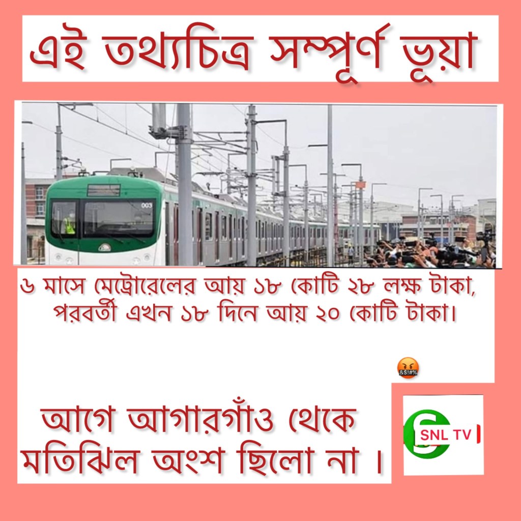 ছাত্র-জনতার আন্দোলন ঘিরে সহিংসতায় গত ১৮ জুলাই মিরপুর-১০ নম্বর গোলচত্বর এলাকায় মেট্রো লাইনের নিচের পুলিশ বক্সে আগুন ধরিয়ে দেওয়া হলে জননিরাপত্তার স্বার্থে ওই দিন বিকেল সাড়ে ৫টার পর মেট্রোরেল চলাচল বন্ধ করে দেওয়া হয়। তার পরেরদিনও একাধিক মেট্রোরেল স্টেশনে হামলা হয়। অবশেষে, ৩৭ দিন বন্ধ থাকার পর গত ২৫ আগস্ট থেকে যাত্রী সেবা দেওয়া শুরু করেছে মেট্রোরেল। আজ (২২ সেপ্টেম্বর) ঢাকা ম্যাস ট্রানজিট কম্পানি লিমিটেড (ডিএসটিসিএল) সূত্রে গণমাধ্যমে মেট্রোরেলের আয় সম্পর্কে একটি সংবাদ ব্যাপকভাবে প্রচার হচ্ছে। প্রচার করা হচ্ছে, চলতি সেপ্টেম্বর মাসের প্রথম ১৮ দিনে ৪৯ লাখ ৯ হাজার ৪৯ জন যাত্রী মেট্রো রেলে ভ্রমণ করেছেন। এতে মেট্রো রেল কর্তৃপক্ষের আয় হয়েছে ২০ কোটি ৬৭ লাখ তিন হাজার ৫৯১ টাকা। এদিকে গত ০৫ আগস্ট তারিখে ছাত্র-জনতার গণঅভ্যুত্থানে ক্ষমতা হারায় শেখ হাসিনার নেতৃত্বাধীন আওয়ামী লীগ সরকার। এরই প্রেক্ষিতে আজ (২২ সেপ্টেম্বর) সামাজিক যোগাযোগ মাধ্যম ফেসবুকে দাবি প্রচার করা হচ্ছে, গণঅভ্যুত্থানের আগে মেট্রোরেলে গত ৬ মাসে আয় ছিলো ১৮ কোটি টাকা। সরকার পরিবর্তনের পর বর্তমানে ১৮ দিনেই আয় ২০ কোটি।