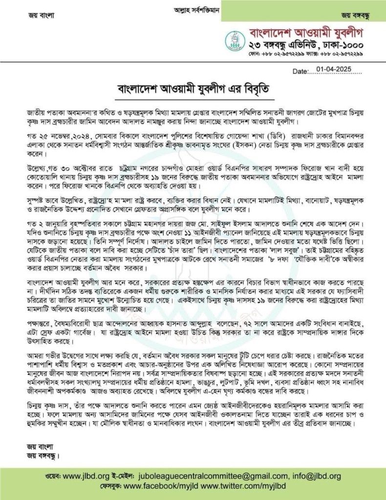 বাংলাদেশ আওয়ামী যুবলীগ আর মনে করে, সরকারের প্রত্যক্ষ হস্তক্ষেপ এর কারনে বিচার বিভাগ স্বাধীনভাবে কাজ করতে পারছে না। দীর্ঘদিন সঠিক তদন্ত ব্যতিরেকে একজন ধর্মীয় গুরুকে শারীরিক ও মানসিক নির্যাতন করার মাধ্যমে এই সরকার যে ফ্যাসিবাদী চরিত্রের তা জাতির সামনে মুখোশ উন্মোচিত হয়ে গেছে। একইসাথে চিন্ময় কৃষ্ণ দাসসহ ১৯ জনের বিরুদ্ধে করা রাষ্ট্রদ্রোহের মিথ্যা মামলাটি অবিলম্বে প্রত্যাহারের দাবী জানাচ্ছে।