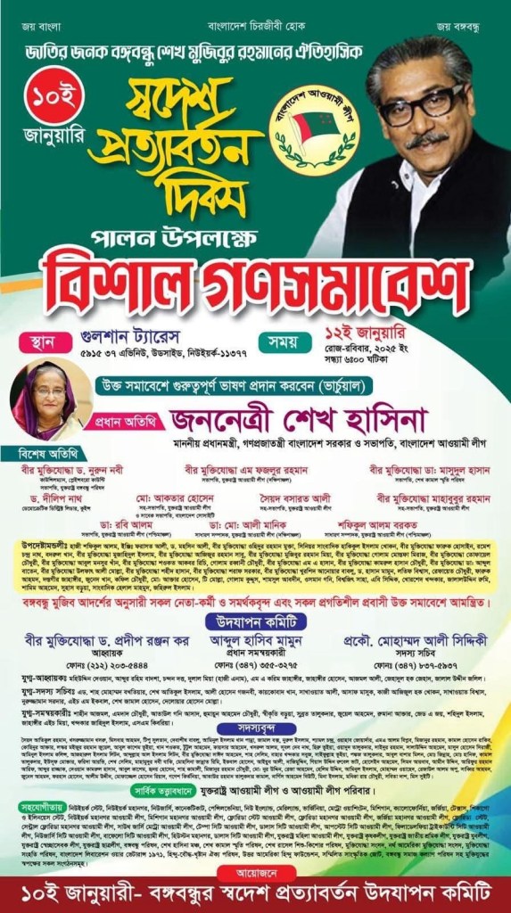 ঐ দিন সন্ধা ৬ ঘটিকায় কুইন্সের জেকশন হাইটের একটি অভিজাত হল গুলসান ট্রেরেস এ বঙ্গবন্ধুর স্বদেশ প্রত্যাবর্তন দিবস পালন করা হবে ।উক্ত সভায় ভার্চুয়ালি যুক্ত হয়ে বক্তব্য রাখবেন বাংলাদেশ আওয়ামীলীগের সভাপতি প্রধানমন্ত্রী শেখ হাসিনা ।