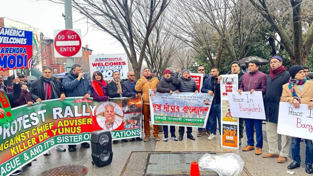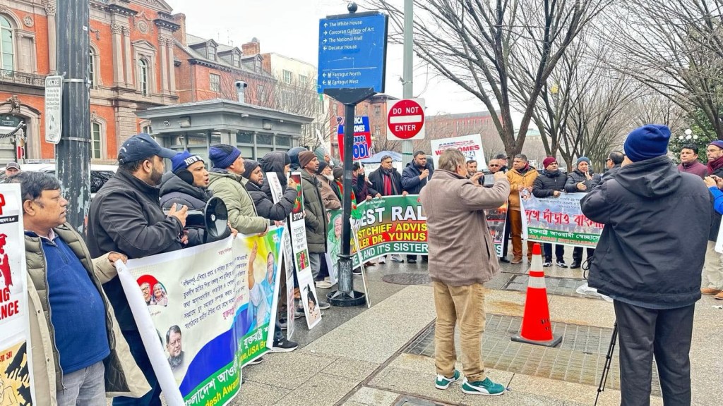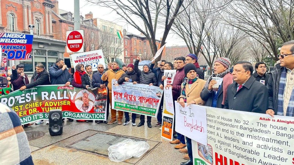 আন্তর্জাতিক ডেস্ক ঃ যুক্তরাষ্ট্রের রাজধানী ওয়াশিংটনে ভারতীয় প্রধানমন্ত্রী ও আমেরিকার প্রেসিডেন্টের মধ্যে বৈঠক চলাকালীন সময়ে হোয়াইট হাউসের সামনে বাংলাদেশের বর্তমান ইউনুস সরকার কতৃক বুলডোজার দিয়ে স্বাধীনতা ঘোষণার প্রতিচ্ছবি বাংলাদেশের স্বাধীনতার স্হপতি বঙ্গবন্ধুর বাড়ি ৩২ নাম্বার সহ আওয়ামী লীগের নেতা-কর্মীদের বাড়ি ঘর লুটপাট অগ্নিসংযোগ করে মাটিতে মিশে দেওয়া এবং যৌথ বাহিনীর “Operation Devil Hunt” নামে সারা দেশে আওয়ামী লীগ নেতাকর্মীদের গ্রেপ্তার ও অমানবিক নির্যাতনের প্রতিবাদে অনির্বাচিত অসাংবিধানিক অন্তর্বর্তীকালীন সরকারের প্রধান ড. মুহাম্মদ ইউনূসের পদত্যাগের দাবিতে আজ বিশাল মানববন্ধন অনুষ্ঠিত হয়েছে ।