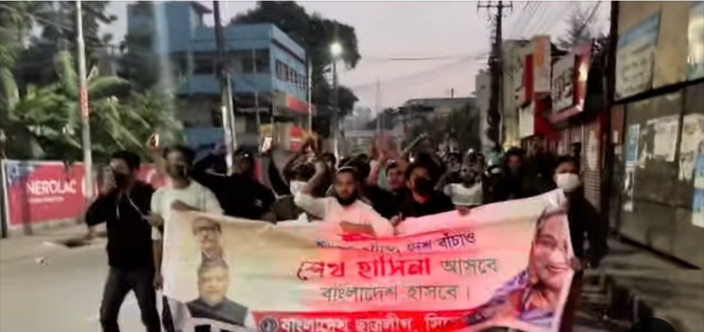 সিলেট প্রতিনিধি ঃ সেনাবাহিনীকে নিয়ে এনসিপি নেতা হাসনাত আব্দুল্লাহ’র পোস্ট দেওয়ার পর সারা দেশে সেনাবাহিনী সতর্ক অবস্থানে রয়েছে ।এমন অবস্হায় ঢাকায় ধানমন্ডি ২৭ এ আওয়ামীলীগের বেশ বড় একটি মিছিল অনুষ্ঠিত হয়েছে গতকাল । প্রায় একই সময়ে সিলেটে ও ছাত্রলীগের একটি মিছিল অনুষ্ঠিত হয়েছে । মিছিলকারিরা আওয়ামীলীগের সভাপতি ও প্রধানমন্ত্রী শেখ হাসিনা ও সিলেট সিটি করপোরেশনের মেয়র আনোয়ারুজ্জামানের ছবি বেনারে লাগিয়ে বিক্ষোভ মিছিল করেছেন । প্রায় শতাধিক নেতাকর্মী এই মিছিলে অংশগ্রহণ করেছেন ।