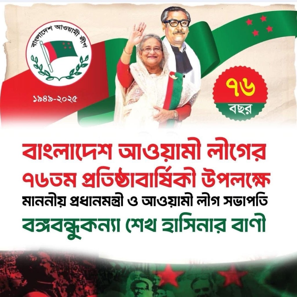 ২৩ জুন ২০২৫, বাংলাদেশের সর্ববৃহৎ রাজনৈতিক দল , বাংলাদেশ আওয়ামী লীগের ৭৬তম প্রতিষ্ঠাবার্ষিকীতে দেশবাসীর প্রতি শুভেচ্ছা ও সংগ্রামী অভিবাদন।