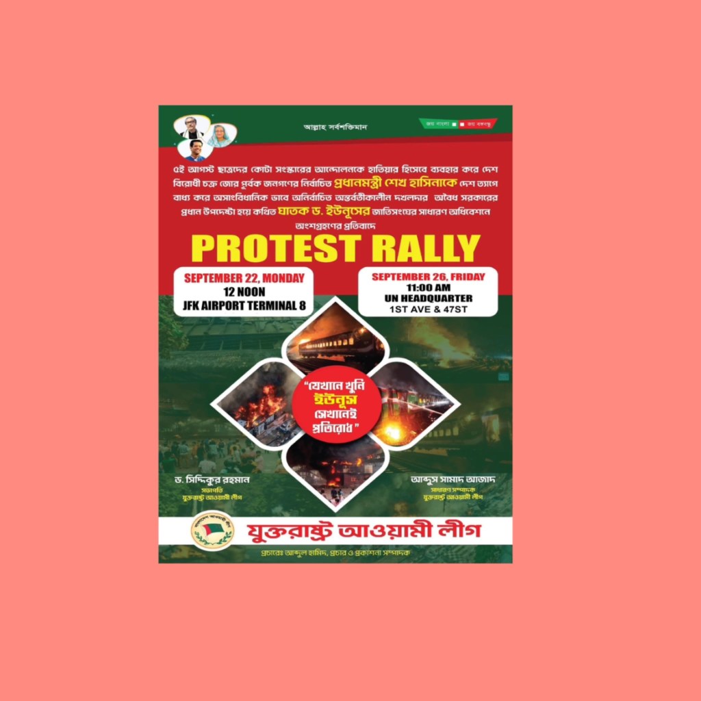 - খুনি-ফ্যাসিস্ট ইউনূসের সম্বর্ধনা স্থলে (Marriott Marquis) সেপ্টেম্বর ২৭ সন্ধ্যার ৭টা যুক্তরাষ্ট্র আওয়ামী লীগ, ভাতৃপ্রতিম ও সহযোগী সংগঠনের নেতাকর্মীদের বিক্ষোভ সমাবেশ।